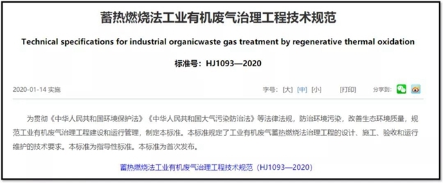 2020年1月14日,生態(tài)環(huán)境部發(fā)布了一個(gè)重磅的行業(yè)技術(shù)規(guī)范,即批準(zhǔn)《蓄熱燃燒法工業(yè)有機(jī)廢氣治理工程技術(shù)規(guī)范》為國家環(huán)境保護(hù)標(biāo)準(zhǔn),并予發(fā)布,標(biāo)準(zhǔn)編號為HJ1093-2020。 該標(biāo)準(zhǔn)與《揮發(fā)性有機(jī)物污染防治技術(shù)政策》、《吸附法工業(yè)有機(jī)廢氣治理工程技術(shù)規(guī)范》、《催化燃燒法工業(yè)有機(jī)廢氣治理工程技術(shù)規(guī)范》...