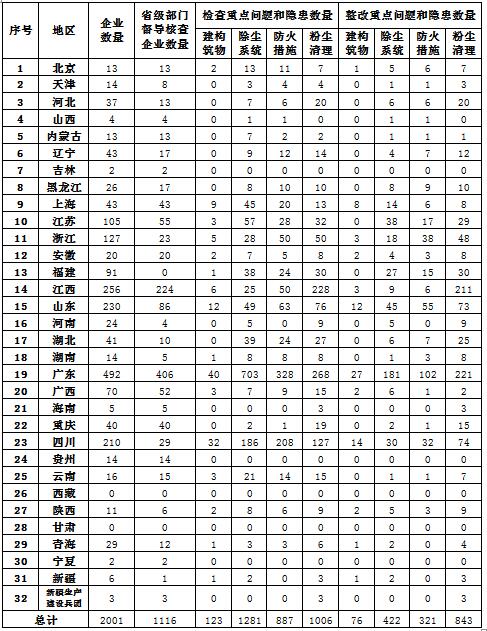 國家安監(jiān)總局辦公廳近日發(fā)布《關(guān)于2017年工貿(mào)行業(yè)專項(xiàng)整治工作進(jìn)展情況的通報(bào)》?!锻▓?bào)》指出,2017年,全國工貿(mào)行業(yè)企業(yè)沒有發(fā)生較大及以上事故。對存在各類隱患的粉塵涉爆企業(yè),限期整改18087家、停產(chǎn)整頓3380家、取締關(guān)閉3601家、執(zhí)法處罰3504萬元?!锻▓?bào)》指出,截至2017年底,各地區(qū)共...